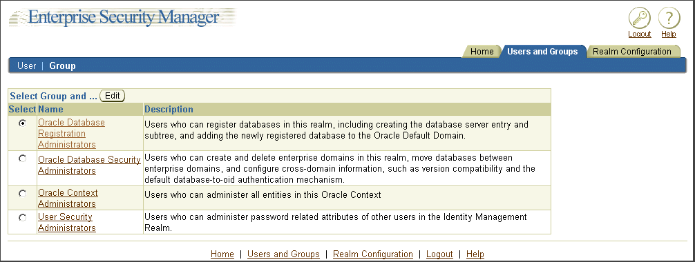 Use this window to select an Enterprise User Security administrative group to edit (change owner, add members, assign directory privileges) or to view its details. These groups are defined in the following table: