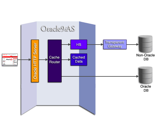Data requests are forwarded to the Cache Router that forwards non-Oracle system data requests to Heterogeneous Services (HS), the generic technology for accessing non-Oracle systems. Heterogeneous Services forwards the request to a transparent gateway agent running on the non-Oracle system.